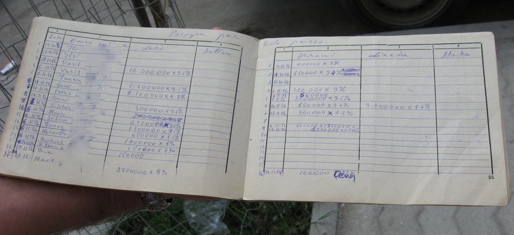 A book of records from a former sekser (broker) listing names of former creditors, amounts deposited in the pyramid schemes Gjallica and Cenaj. As the records indicate, the sekser managed deposits in Albanian lek, Greek drachmas, Italian liras, and German deutschmarks. Photo by Smoki Musaraj (Last names of former creditors have been blurred to protect their anonymity)